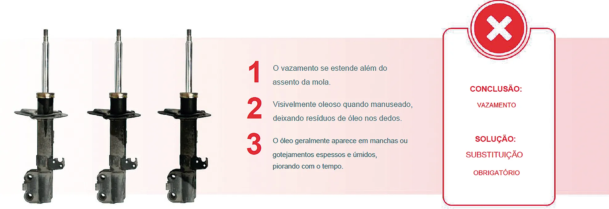 Funcionamento (Modelos Pressurizados a Gás): Em amortecedores pressurizados (a maioria), um vazamento real de óleo é acompanhado da perda de gás. A evidência clara é que a haste deixa de subir sozinha, confirmando a falha conjunta de vedação e a necessidade de substituição.