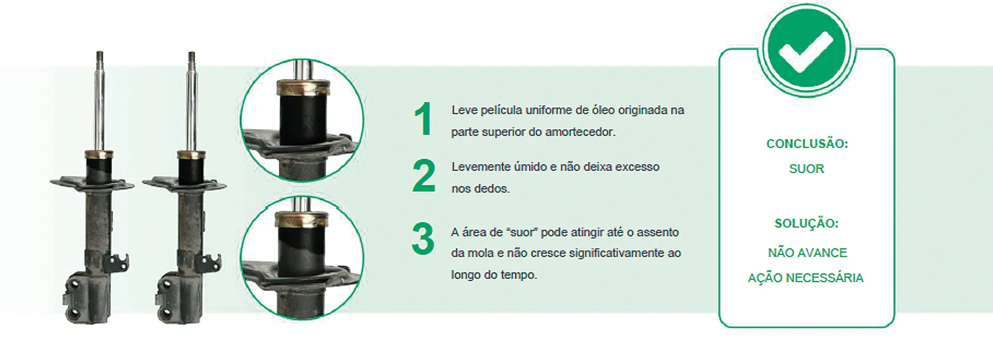 Durante o manuseio ou logo após a instalação, é totalmente normal que o amortecedor apresente um aspecto úmido em seu corpo, especialmente quando a peça aquece (seja em teste fora do veículo ou em funcionamento).